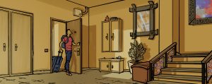 El personaje principal vuelve de un viaje, llega a su casa, deshace el equipaje y se cambia. Allí hay algunas pistas sobre nuestro protagonista: una telelupa y un bastón plegado. Sale a pasear y todo va bien hasta que tropieza y cae en una “madriguera” muy particular.